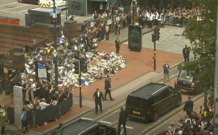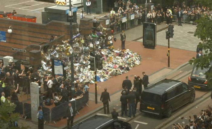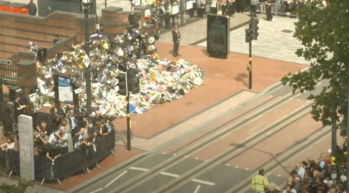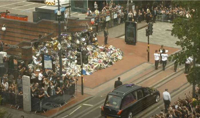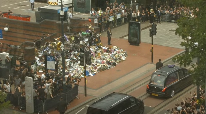 Dopo il passaggio di quattro motociclette della polizia e una banda, si è visto arrivare il carro funebre contenente la bara dell’indimenticabile Mad Man, fermatosi davanti l’ormai celebre panchina dedicata alla band, oggi luogo pieno di omaggi floreali ed altro dedicati. Giusto un paio di minuti per vedere la moglie, Sharon, accompagnata dai tre figli, scendere da uno dei 6 van a seguito del corteo, per lasciare un omaggio tra i centinaia già presenti. Poco dopo qualche parente si è unito al rito, per poi girarsi tutti verso i fan presenti ed accennare un breve saluto, per poi continuare la marcia.